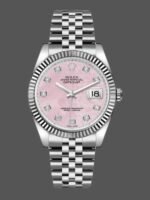 Rolex Datejust 116234 Pink MOP Diamonds Dial 36mm Lady Replica Watch.36mm Oystersteel Stainless Steel Case,Mother of Pearl Pink Dial Set with Diamonds.Date window displayed at the 3 o’clock position with a cyclops magnifying lens.White Gold Fluted Bezel.Concealed Folding Crownclasp Deployment Buckle.Bracelet with brushed finished outer links and polished finished center links.