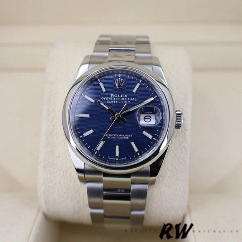 Rolex Datejust 126200 Blue Motif Wave Dial Stainless Steel 36MM Unisex Replica Watch,Stainless steel case 36.0 mm in diameter,screw-down steel back, screw-down crown with twinlock double waterproofness system, Stainless steel smooth domed bezel. Scratch resistant sapphire crystal with cyclops magnifier. Blue Motif Wave Dial With Index Hour Markers, instantaneous date at 3 o’clock with rapid setting, Stainless steel oyster bracelet with a fliplock clasp.
