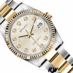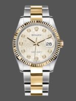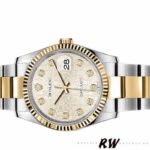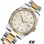 Rolex Datejust 126233 Silver Jubilee Dial 36MM Unisex Replica Watch, 36mm yellow Rolesor case with Oystersteel monobloc middle case, screw-down steel back, screw-down yellow crown, yellow fluted bezel, white mother-of-pearl dial, 10 diamond hour markers,Date displayed under cyclops lens in window at 3 o’clock with instantaneous date and rapid setting.Yellow Rolesor Oyster bracelet with flat three-piece links, folding Oysterclasp buckle with Easylink comfort extension link.