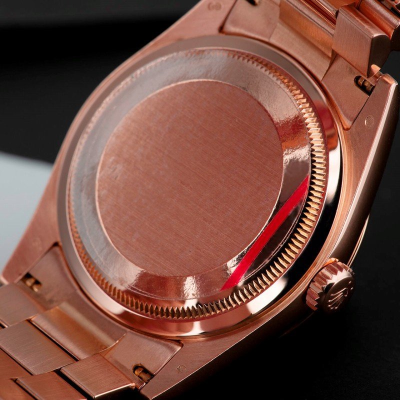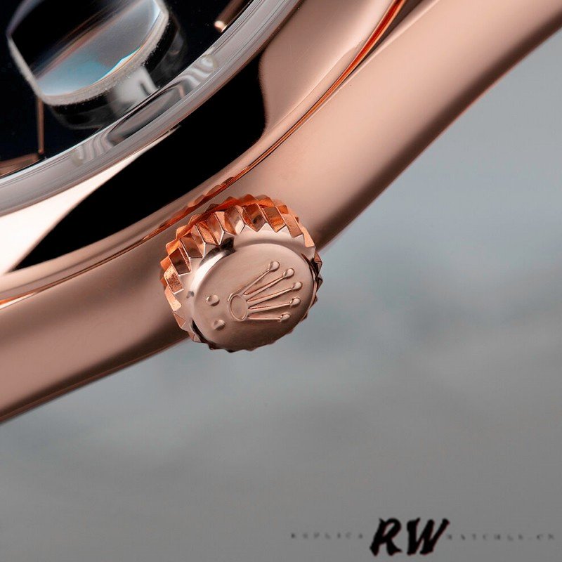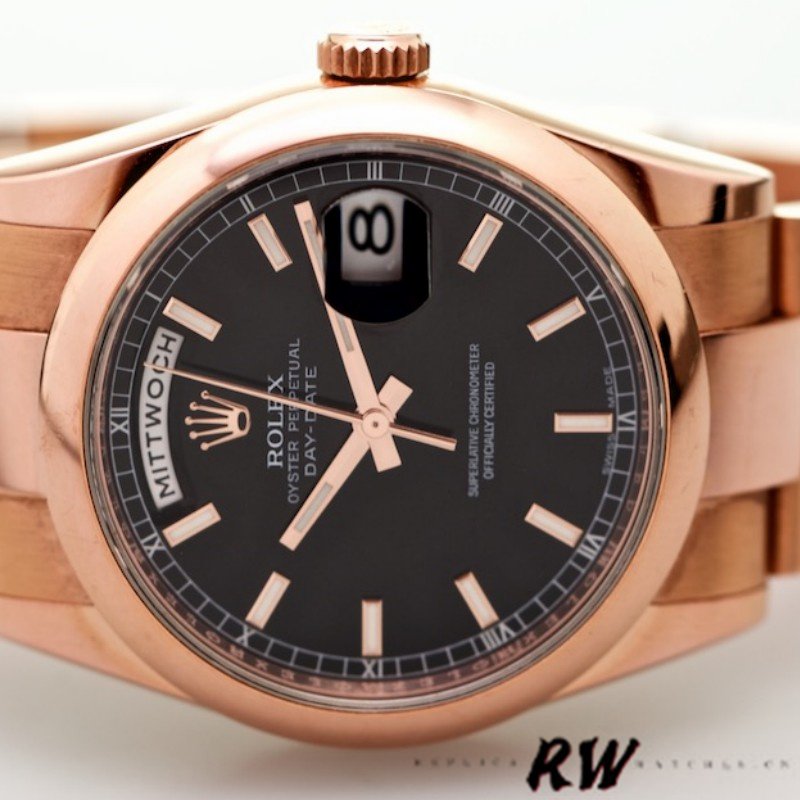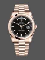Rolex Day Date 118205 Black Dial 36mm Unisex Replica Watch.36mmRound case shape.Fixed -domed everose gold bezel. Black dial with rose-gold tone hands and Index numeral hour markers. Minute markers around the outer rim. Date display at 3 o’clock; day display at 12 o’clock.. Automatic movement. Scratch resistant sapphire crystal. Screw down crown. Solid case back.Concealed Crown clasp.