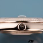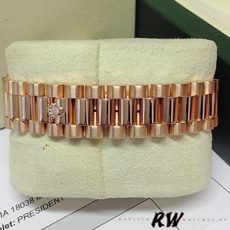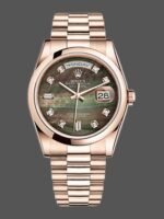 Rolex Day-Date 118205 Dark Mother of Pearl Black Dial 36mm Unisex Replica Watch. This classic 36mm Everose gold model featuring a stunning black Mother of Pearl diamond dot dial housing an external Cyclops date aperture at 3 O’clock and a day aperture in-between 11 and 1 O’clock. The dial is surrounded by a rose gold domed bezel, polished finish shoulders and case sides on a rose gold Rolex president bracelet.
