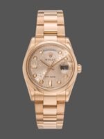 Rolex Day-Date 118205 Jubilee Champagne Dial 36mm Unisex Replica Watch.36mm Rose Gold case,Jubilee Champagne Dial.The dial is surrounded by a rose gold domed bezel.Diamond hour markers, 2 of which are baguette diamonds at 6 and 9 o’clock, day display at 12 o’clock, date display at 3 o’clock, Rose Gold bezel, winder, President bracelet and folded clasp, sapphire crystal glass.