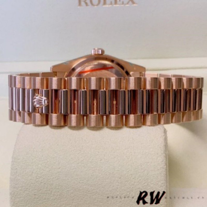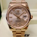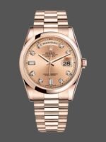 Rolex Day-Date 118205 Rose Gold Champagne Diamond Dial 36mm Unisex Replica Watch has a Rose Gold 36 mm Round Case with Screw Down Crown and a Rose Gold Bezel. This watch has an attractive Champagne Dial with Diamonds Dial Markers. Scratch Resistant Sapphire Crystal.Everose Gold Case and President Bracelet.