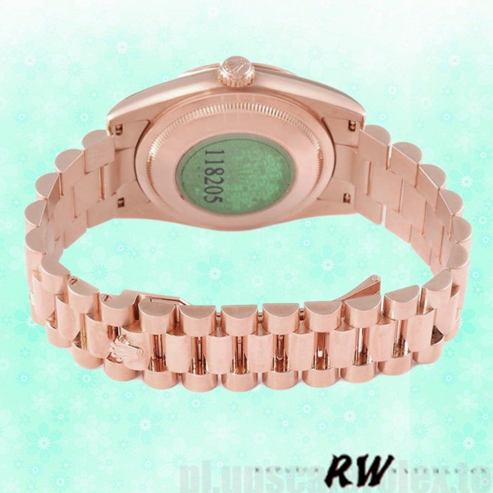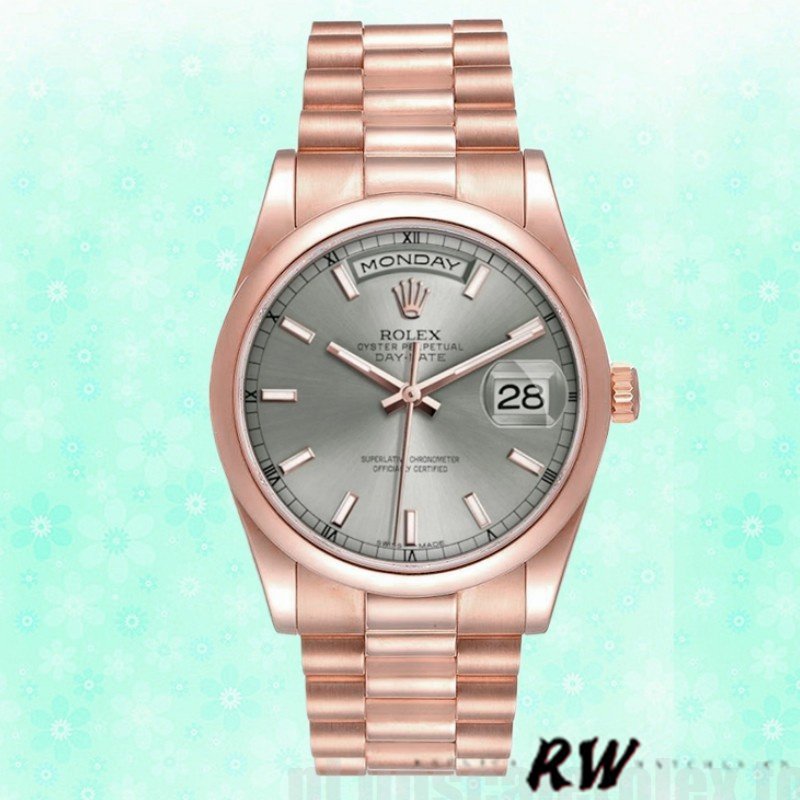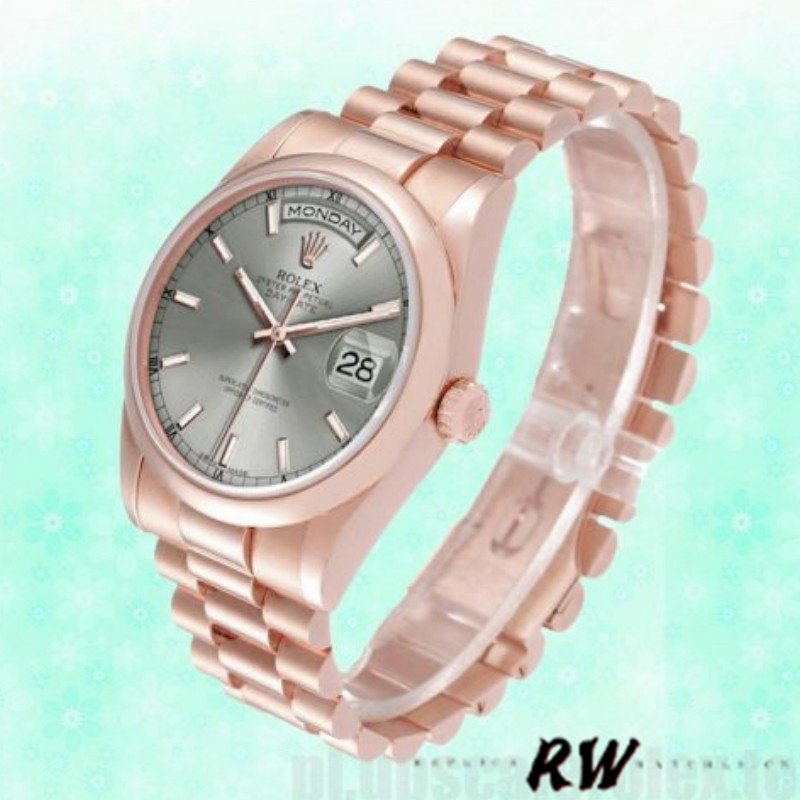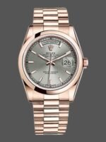 Rolex Day-Date 118205 Rose Gold Rhodium Grey Dial 36mm Unisex Replica Watch.36mm everose gold case with a everose gold President bracelet. Fixed – domed everose gold bezel. Rhodium dial with rose-gold tone hands and Index numeral hour markers. Date display at 3 o’clock; day display at 12 o’clock.. Automatic movement. Scratch resistant sapphire crystal. Screw down crown.