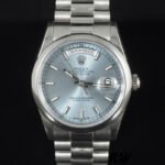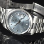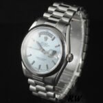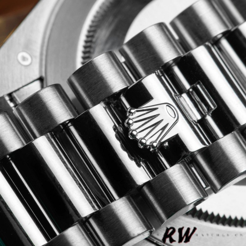 Rolex Day-Date 118206 Ice Blue Dial Polished Platinum Bezel 36mm Unisex Replica Watch . 36 mm Solid Oyster platinum case, screw-down caseback and crown. Polished Platinum Domed Bezel. Ice blue dial with day and date display , day display at 12 o’clock, date display at 3 o’clock, sapphire crystal glass.Platinum President bracelet, semi-circular 3-row links. Concealed Crownclasp with folding buckle.