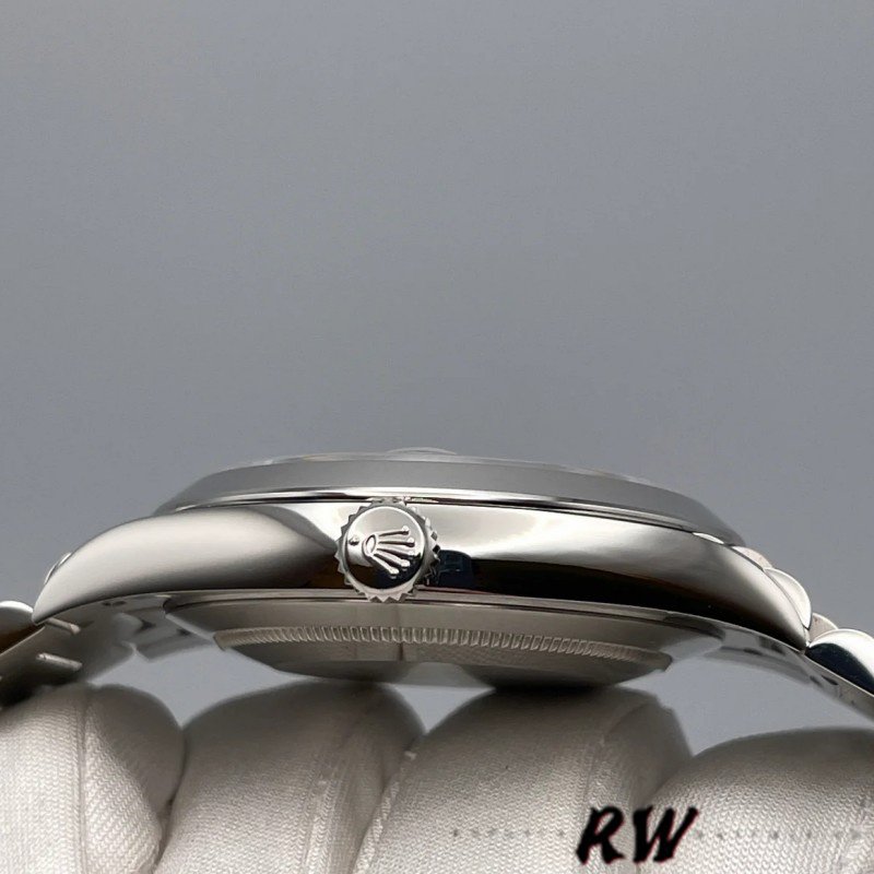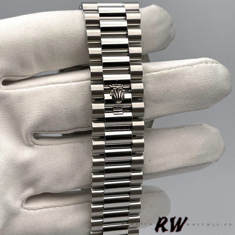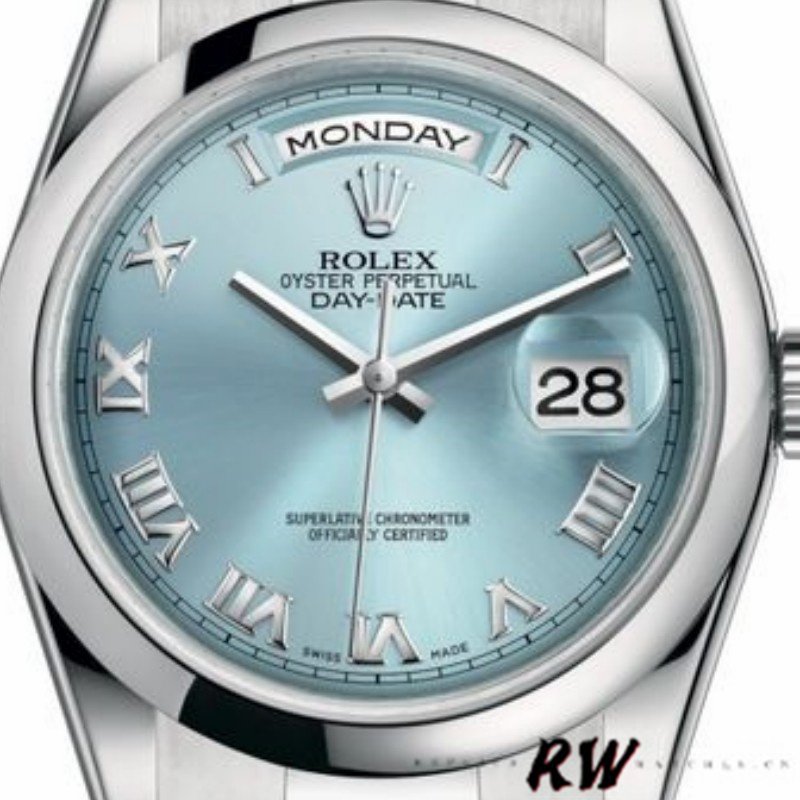 Rolex Day-Date 118206 Ice Blue Roman Numeral Dial 36mm Unisex Replica Watch. With a silver-blue dial and gold Roman numerals place hour markers on the President bracelet.The platinum version with a smooth bezel is perfect for small men’s or women’s wrists as it has a 36mm case. The day of the week at 12 o’clock, which is written in full in any language of the world, is a feature of these watches, This bracelet is available only in precious metals and has 3 rows of smooth, flat links that will never damage the cuffs of a shirt.