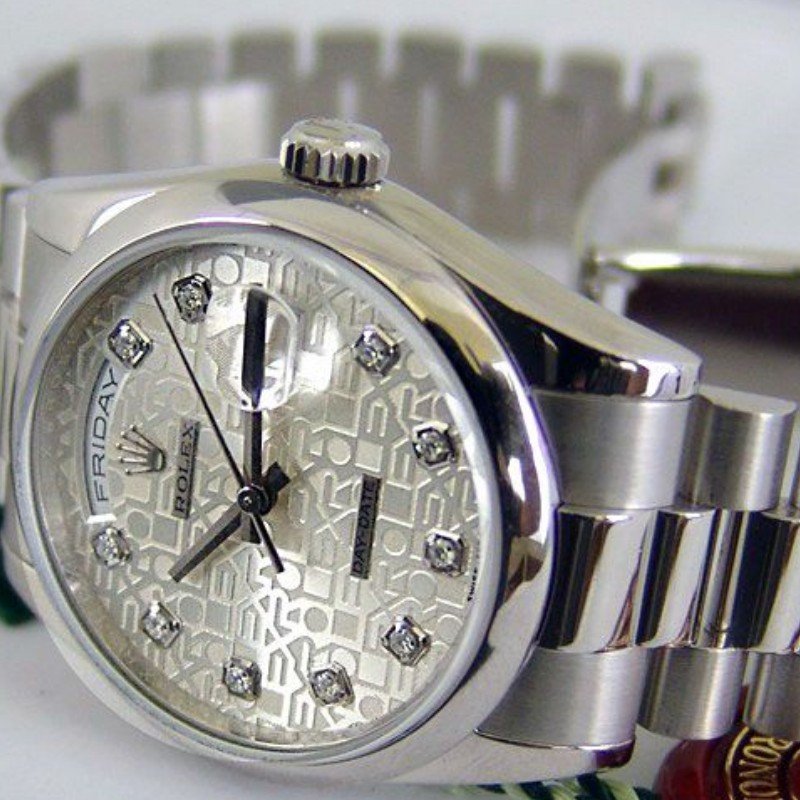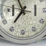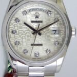 Rolex Day-Date 118206 Jubilee Silver Dial Diamonds 36mm Unisex Replica Watch. 36mm diameter polished round platinum case with screw-down Twinlock winding crown, polished domed platinum bezel, platinum President bracelet with solid links and hidden clasp, Jubilee Silver Dial Set with Diamonds with round and 2 baguette-shaped diamond hour markers, day calendar at 12 o’clock, date calendar at 3 o’clock, scratch-resistant sapphire crystal.