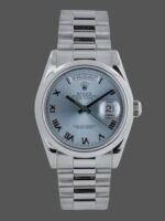 Rolex Day Date 118206 Platinum Ice Blue dial 36mm Unisex Replica Watch. With a silver-blue dial and gold Roman numerals place hour markers on the President bracelet.The platinum version with a smooth bezel is perfect for small men’s or women’s wrists as it has a 36mm case. The day of the week at 12 o’clock, which is written in full in any language of the world, is a feature of these watches, This bracelet is available only in precious metals and has 3 rows of smooth, flat links that will never damage the cuffs of a shirt.
