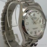 Rolex Day-Date 118206 Platinum White Mother of Pearl Diamond Dial 36mm Unisex Replica Watch. 36mm diameter polished round platinum case with screw-down Twinlock winding crown, polished domed platinum bezel, platinum President bracelet with solid links and hidden clasp, Mother of Pearl White Dial Set with Diamonds with round and 2 baguette-shaped diamond hour markers, day calendar at 12 o’clock, date calendar at 3 o’clock, scratch-resistant sapphire crystal.