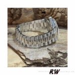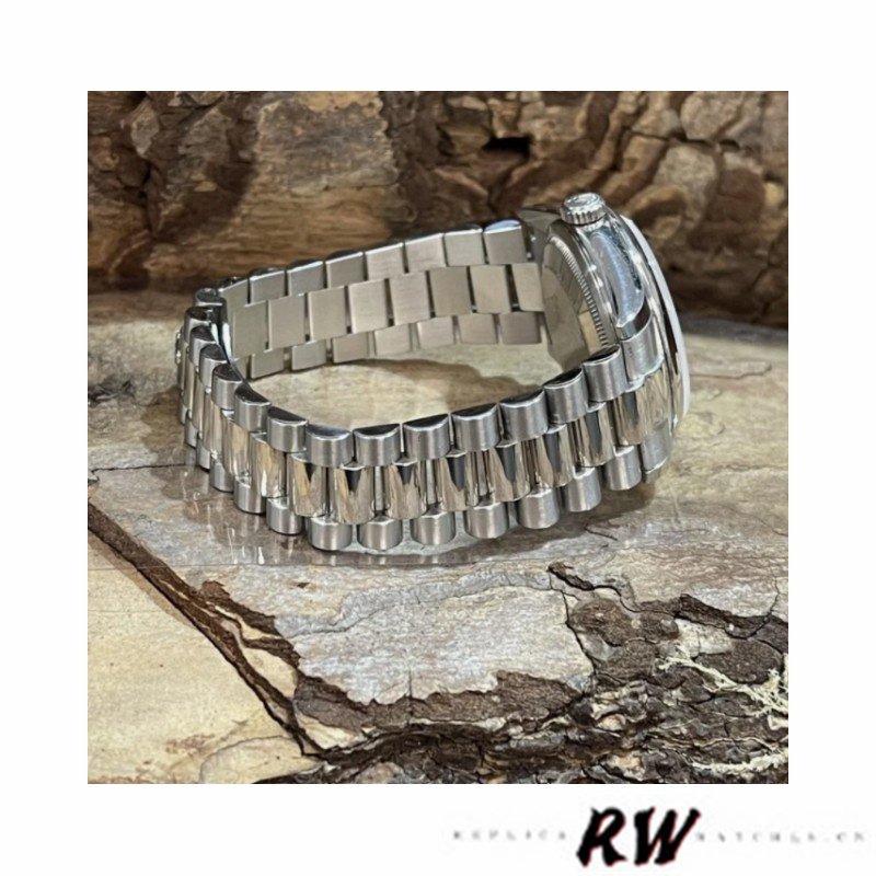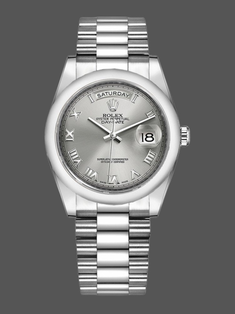 Rolex Day-Date 118206 Rhodium Grey Dial Roman Numerals 36mm Unisex Replica Watch. Rhodium Grey Dial with Roman Numerals place hour markers on the President bracelet.The platinum version with a smooth bezel is perfect for small men’s or women’s wrists as it has a 36mm case. The day of the week at 12 o’clock, which is written in full in any language of the world, is a feature of these watches, This bracelet is available only in precious metals and has 3 rows of smooth, flat links that will never damage the cuffs of a shirt.