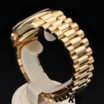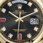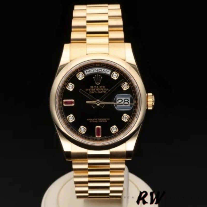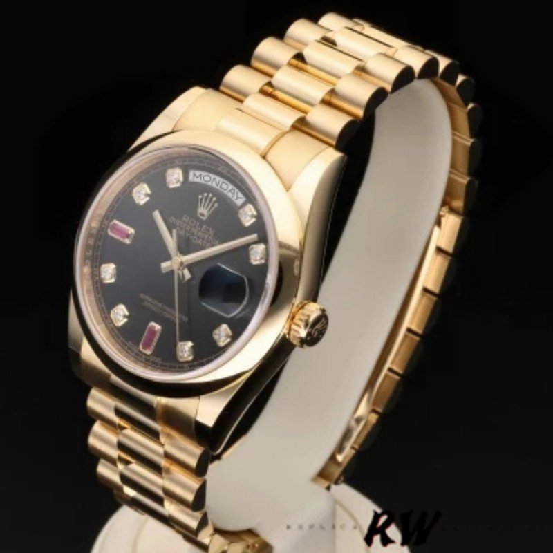 Rolex Day-Date 118208 Black Diamond Dial 36mm Unisex Replica Watch. 36mm yellow gold case with a yellow gold Rolex president bracelet. Fixed domed yellow gold bezel. Black dial with gold-tone hands and Diamonds numeral hour markers. Minute markers around the outer rim. Date display at the 3 o’clock position. Day of the week display centered on the 12 o’clock position. Scratch resistant sapphire crystal. Screw down crown. Solid case back. Round case shape.