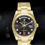 Rolex Day-Date 118208 Black Diamond Dial Yellow Gold case 36mm Unisex Replica Watch . 36mm yellow gold case with a yellow gold Rolex president bracelet. Fixed domed yellow gold bezel. Black dial with gold-tone hands and Diamonds numeral hour markers. Minute markers around the outer rim. Date display at the 3 o’clock position. Day of the week display centered on the 12 o’clock position. Scratch resistant sapphire crystal. Screw down crown. Solid case back. Round case shape.