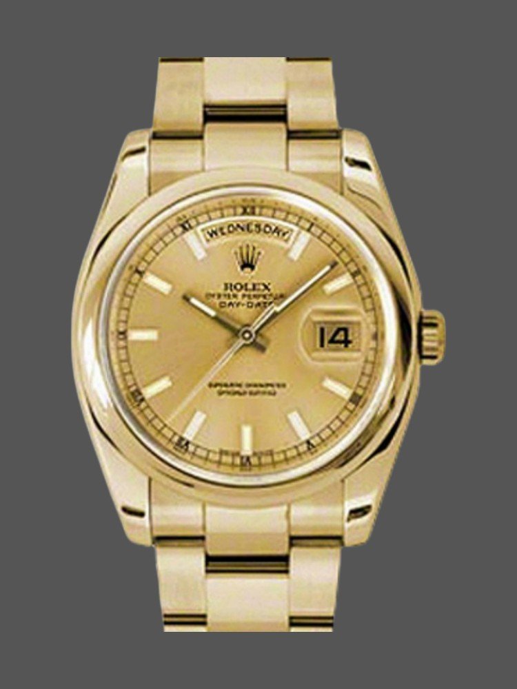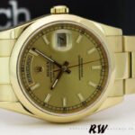 Rolex Day-Date 118208 Champagne Dial 36mm Unisex Replica Watch. 36mm yellow gold case with a yellow gold Rolex president bracelet. Fixed domed yellow gold bezel. Champagne Dial with Index Hour Markers. Minute markers around the outer rim.Date display at the 3 o’clock position. Day of the week display centered on the 12 o’clock position. Scratch resistant sapphire crystal. Screw down crown. Solid case back. Round case shape.