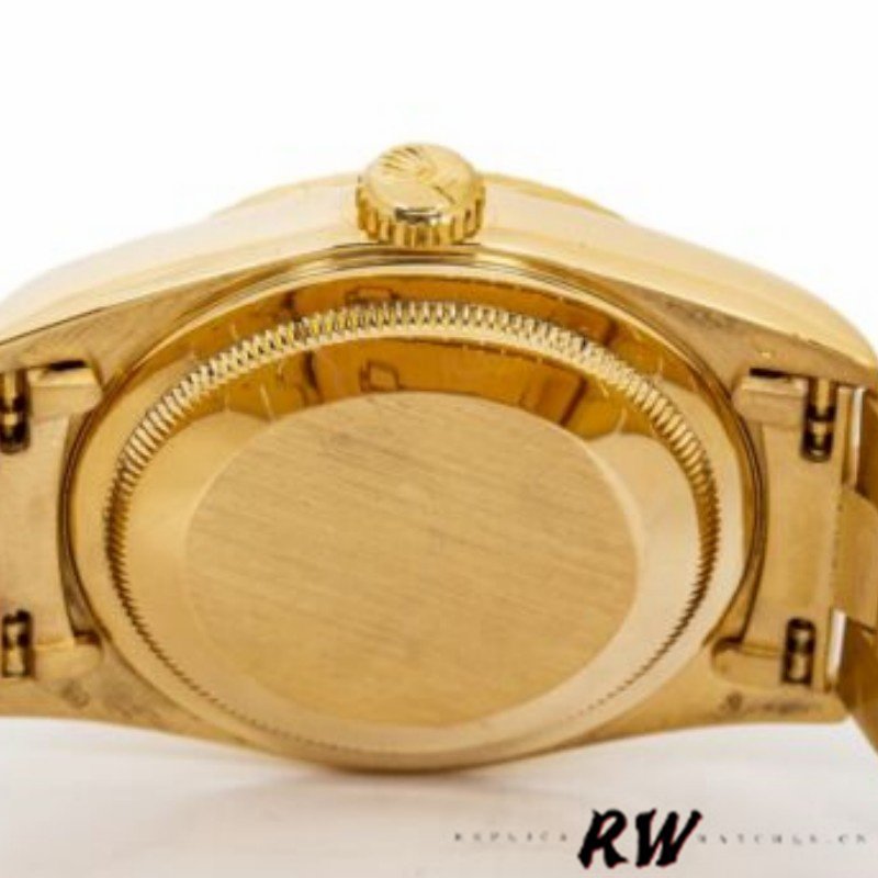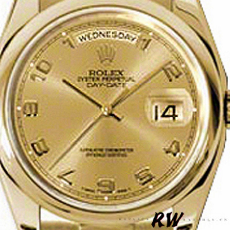 Rolex Day-Date 118208 champagne dial Arabic Numeral Hour Markers yellow gold 36mm Unisex Replica Watch. 36mm yellow gold case with a yellow gold Rolex president bracelet. Fixed domed yellow gold bezel. champagne dial Arabic Numeral Hour Markers. Minute markers around the outer rim.Date display at the 3 o’clock position. Day of the week display centered on the 12 o’clock position. Scratch resistant sapphire crystal. Screw down crown. Solid case back. Round case shape.