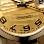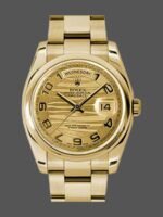 Rolex Day-Date 118208 Yellow Gold Arabic Numeral Wave Champagne Dial 36mm Unisex Replica Watch. 36mm yellow gold case with a yellow gold president bracelet. Fixed domed yellow gold bezel. Arabic Numeral Wave Champagne Dial with spanish days in place of the hour twelve, Date display at the 3 o’clock position.polished bezel, fitted to a yellow gold president bracelet. Scratch resistant sapphire crystal. Screw down crown. Solid case back.