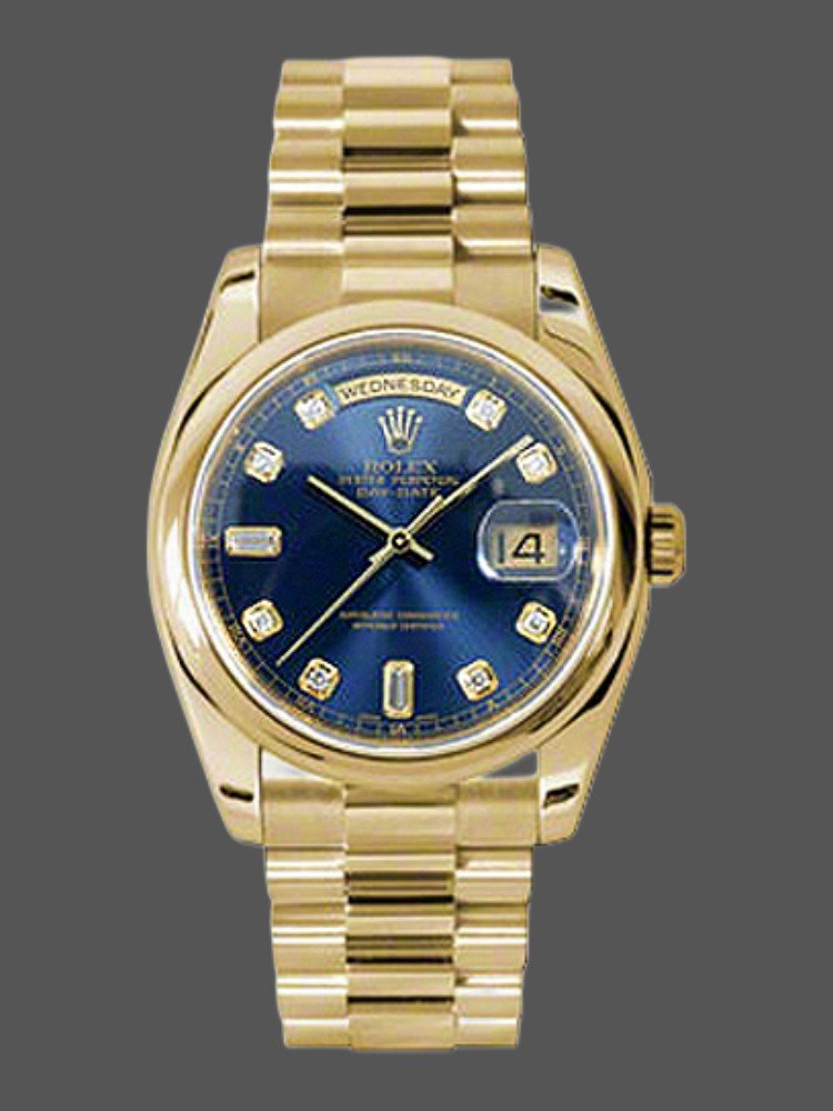 Rolex Day-Date 118208 Yellow Gold Blue Diamond Dial 36mm Unisex Replica Watch has a Yellow Gold 36 mm Round Case with Screw Down Crown and a Yellow Gold Bezel. This Day-Date has an attractive Blue Dial with Diamonds Dial Markers. The reliable Yellow Gold President Bracelet will look great on your wrist.