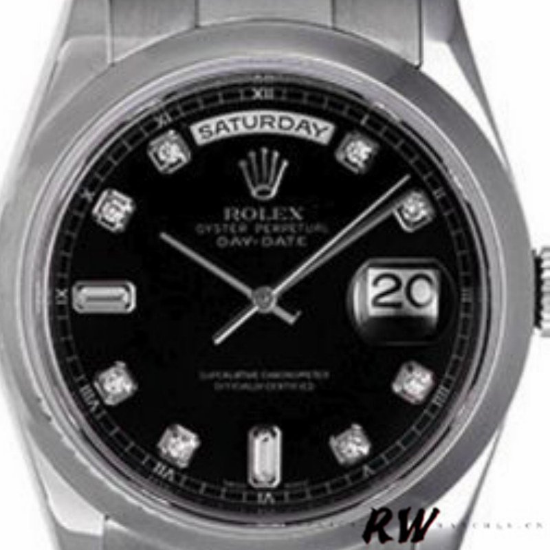 Rolex Day-Date 118209 Black dial 36mm Unisex Replica Watch. 36mm white gold case with a white gold oyster bracelet. Fixed domed white gold bezel. Black dial with silver-tone hands and diamod hour markers. Minute markers around the outer rim. Date at 3 o’clock; Day at 12 o’clock. Scratch resistant sapphire crystal. Screw down crown. Round case shape. Oysterclasp clasp.