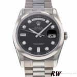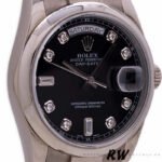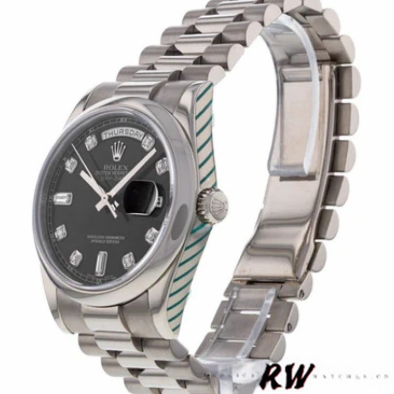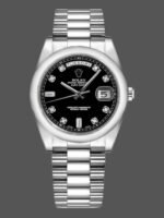 Rolex Day-Date 118209 Black dial white gold 36mm Unisex Replica Watch. 36mm white gold case with a white gold oyster bracelet. Fixed domed white gold bezel. Black dial with silver-tone hands and diamod hour markers. Minute markers around the outer rim. Date at 3 o’clock; Day at 12 o’clock. Scratch resistant sapphire crystal. Screw down crown. Round case shape. Oysterclasp clasp.