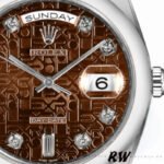 Rolex Day-Date 118209 Jubilee Chocolate Brown Diamonds Dial 36mm Unisex Replica Watch. 36mm white gold Case .Jubilee Chocolate Brown Dial With Manufacturer Serial Numbers , Two bagettues in place of the hour six and nine, with spanish days in place of the hour twelve, Date display at the 3 o’clock position.polished bezel,White Gold Domed Bezel and Oyster Bracelet,Scratch Resistant Sapphire Crystal.