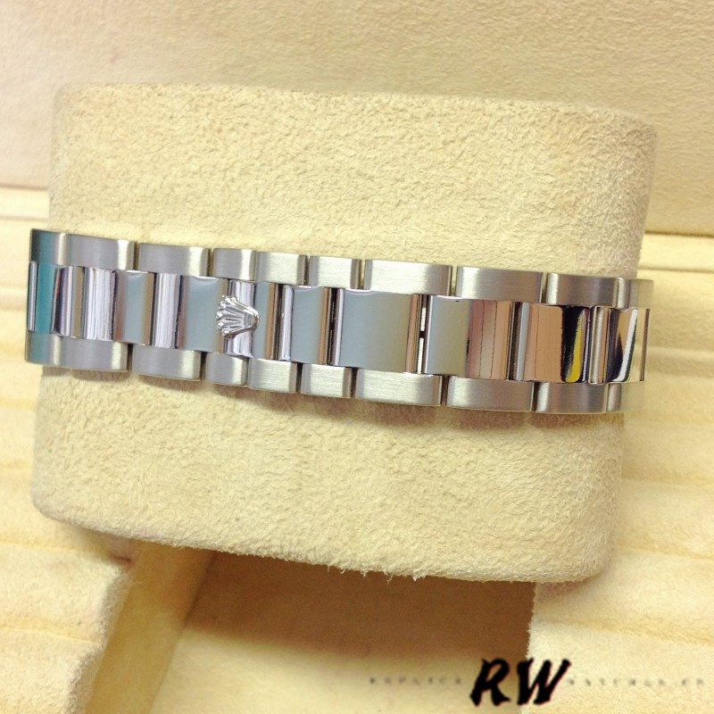 Rolex Day-Date 118209 Silver Diamond Dial Automatic 36mm Unisex Replica Watch featuring a silver diamond dot dial housing an external Cyclops date aperture at 3 O’clock and a day aperutre in-between 11 and 1 O’clock surrounded by a white gold domed bezel, polished finish shoulders and case sides. This particular watch comes on a white gold Rolex Oyster bracelet.
