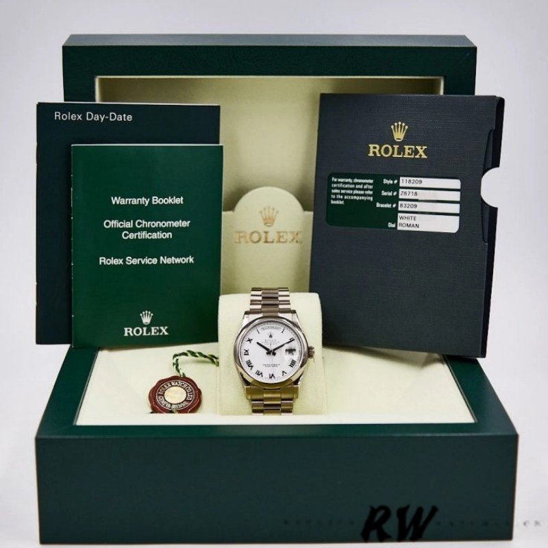 Rolex Day-Date 118209 White Gold White Dial 36mm Unisex Replica Watch. 36mm white gold case, white gold case back and white gold bracelet. As normal for a Day Date, it includes a magnification cyclops on the sapphire crystal at 3 o’clock and the day window at 12 o’clock, which can be adjusted through a quickset. The white dial includes polished Roman numeral hour markers and gold applied hour and minute hands. The President style bracelet includes an invisible folding clasp.