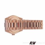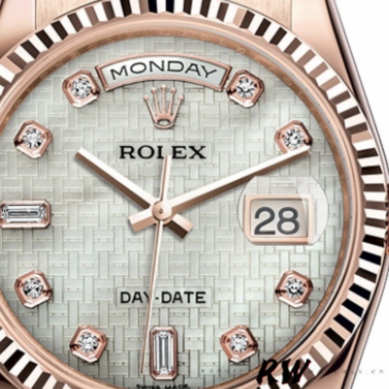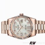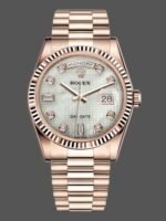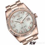 Rolex Day-Date 118235 Mother of Pearl Dial 36mm Unisex Replica Watch has a Rose Gold 36 mm Monobloc middle Case with Screw Down Crown and a Rose Gold Fluted Bezel. White mother-of-pearl with oxford motif set with diamonds.Centre hour, minute and seconds hands. Instantaneous date and day in windows on the dial with rapid setting. Stop seconds for precise time setting. Diamonds in gold settings and baguette-cut diamonds at 6 and 9 o’clock.The reliable Rolex Rose Gold President Bracelet will look great on your wrist.