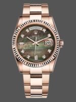 Rolex Day-Date 118235 Mother of pearl diamond dial 36mm Unisex Replica Watch. 36mm everose gold case with a everose gold president bracelet. Fixed – fluted everose gold bezel. The Tahitian mother of pearl Roman numeral dial.set with 10 diamonds.Date display at 3 o’clock; day display at 12 o’clock. Scratch resistant sapphire crystal. Screw down crown. Solid case back.