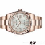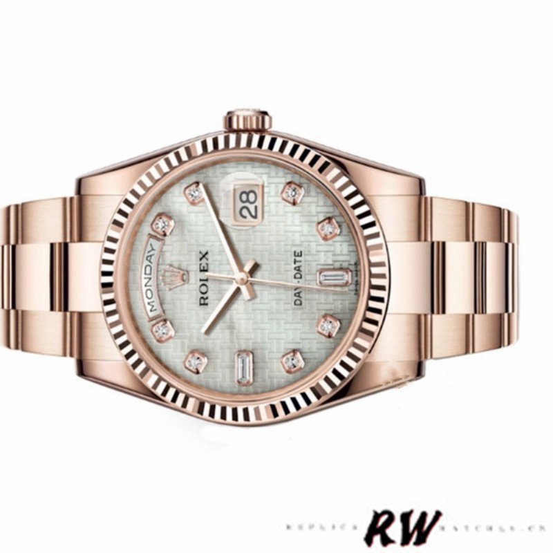 Rolex Day-Date 118235 Mother of Pearl White Dial 36mm Unisex Replica Watch has a Rose Gold 36 mm Monobloc middle Case with Screw Down Crown and a Rose Gold Fluted Bezel. White mother-of-pearl with oxford motif set with diamonds.Centre hour, minute and seconds hands. Instantaneous date and day in windows on the dial with rapid setting. Stop seconds for precise time setting. Diamonds in gold settings and baguette-cut diamonds at 6 and 9 o’clock.The reliable Rolex Rose Gold President Bracelet will look great on your wrist.