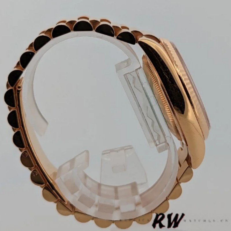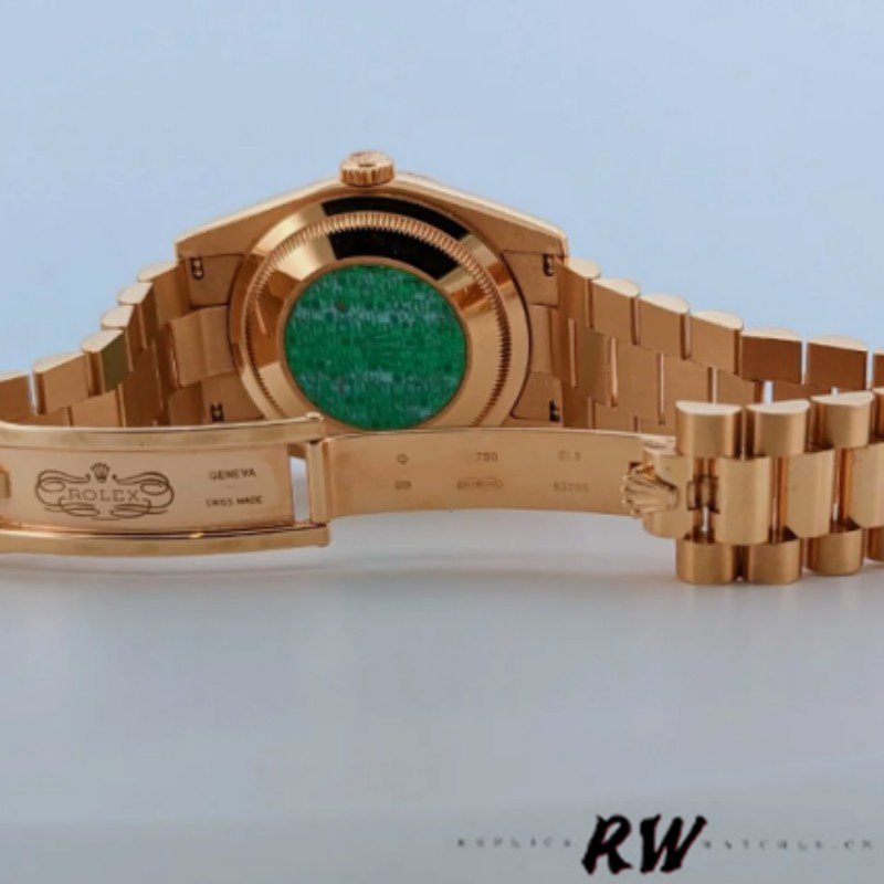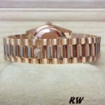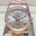 Rolex Day-Date 118235 Pink Roman Numeral dial 36mm Lady Replica Watch has a Rose Gold 36 mm Round Case with Screw Down Crown and a Rose Gold Fluted Bezel. Pink Roman Dial with the day at the 12 o’clock and the date at the 3 o’clock.Rose Gold President Bracelet with the heavy band Folding Crownclasp.
