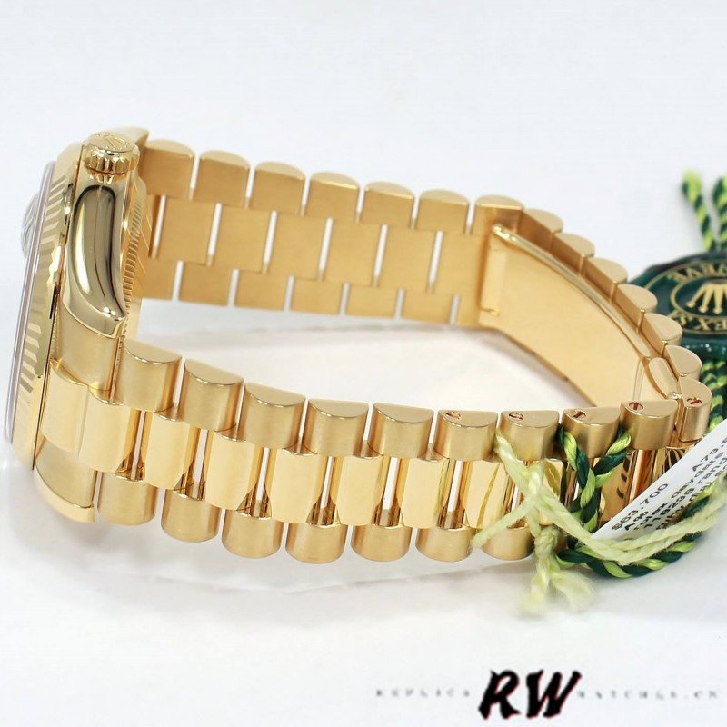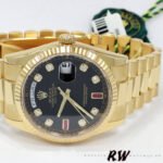 Rolex Day Date 118238 Black Diamond Dial Fluted Bezel 36mm Mens Replica Watch.36mm yellow gold Case and Fluted Bezel. Featuring a black diamond dot and baguette cut ruby dial,Minute markers around the outer rim. Date display at 3 o’clock; day display at 12 o’clock. Scratch resistant sapphire crystal. Screw down crown. Solid case back.Yellow gold President bracelet.