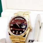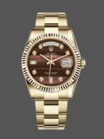 Rolex Day-Date 118238 Oyster Bracelet Diamond Bulls Eye Dial 36mm Unisex Replica Watch.36mm yellow gold Case.Bull’s eye dial with yellow gold-tone hands and Diamonds hour markers. Minute markers around the outer rim.Date display at 3 o’clock; day display at 12 o’clock.Scratch resistant sapphire crystal. Screw down crown. Solid case back and Yellow gold Fluted bezel and President Bracelet.