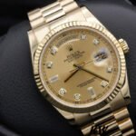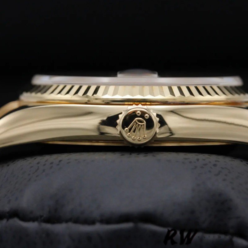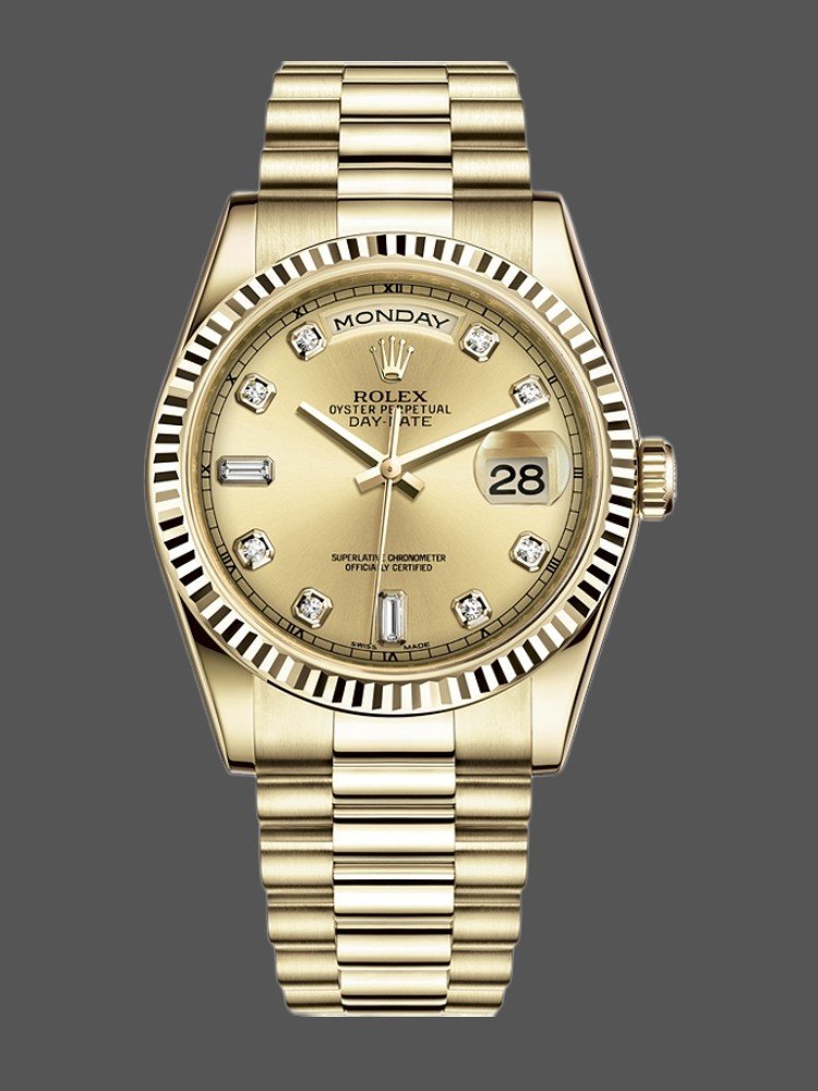 Rolex Day-Date 118238 Yellow Gold Diamond Champagne Dial 36mm Unisex Replica Watch has a Yellow Gold 36 mm Round Case with Screw Down Crown and a Yellow Gold Fluted Bezel. Featuring a champagne diamond dot dial housing an external Cyclops date aperture at 3 O’clock and a day aperture in-between 11 and 1 O’clock surrounded by a yellow gold fluted bezel, The reliableYellow Gold Oyster Bracelet will look great on your wrist.