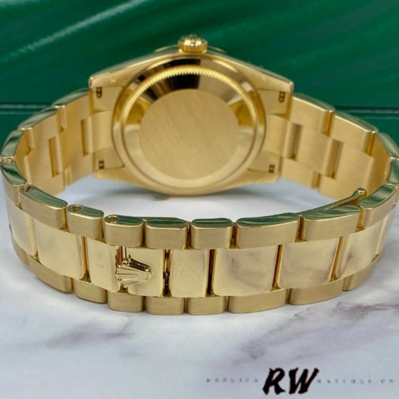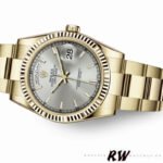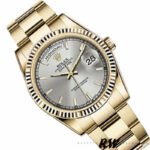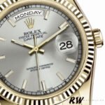 Rolex Day-Date 118238 Yellow Gold Silver dial Fluted Bezel 36mm Unisex Replica Watch has a Yellow Gold 36 mm Round Case with Screw Down Crown and a Yellow Gold Fluted Bezel. Featuring a silver baton dial housing an external Cyclops date aperture at 3 O’clock and a day aperture in-between 11 and 1 O’clock , polished finish shoulders and case sides.Solid case back. The reliable Yellow Gold Oyster Bracelet will look great on your wrist.
