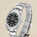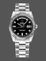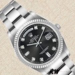 Rolex Day-Date 118239 Black Diamonds Dial 36mm Unisex Replica Watch has a 36mm white gold case, an white gold presidential bracelet with crown clasp and an white gold fluted bezel.Black dial with diamond markers.Diamond hour markers (2 baguettes at 6 and 9 o’clock) day display at 12 o’clock, date display at 3 o’clock from the nineties,scratch-resistant sapphire crystal.