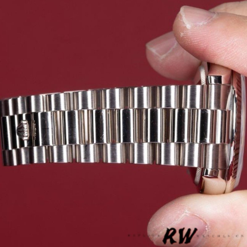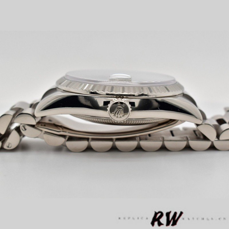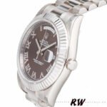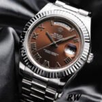 Rolex Day-Date 118239 Chocolate Brown Dial 36mm Unisex Replica Watch. 36mm white gold case with white gold fluted bezel.Chocolate Brown Dial with Roman Numerals, Date display at 3 o’clock position and day display at 12 o’clock position with a cyclops magnifying lens. White gold Oyster bracelet, hidden deployant clasp. Sapphire crystal. White gold case back.
