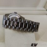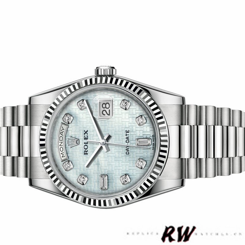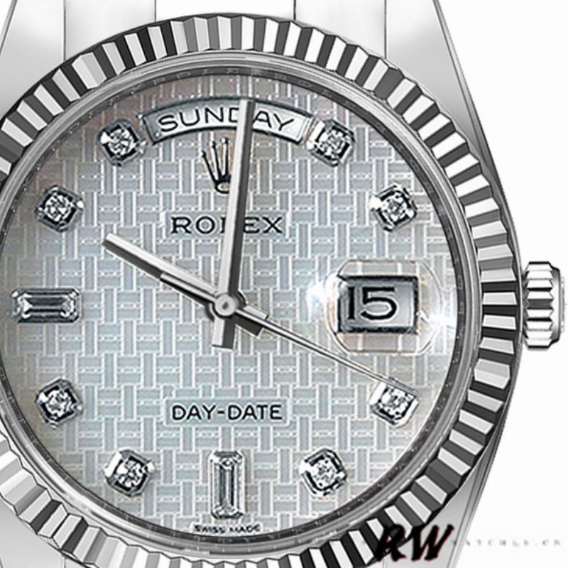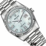 Rolex Day-Date 118239 Mother of Pearl White Dial Fluted Bezel 36mm Unisex Replica Watch. 36mm white gold case with a white gold Rolex Oyster bracelet. Fixed – fluted White gold bezel.A unique mother-of-pearl dial in platinum White with a guilloché oxford motif and diamond markers,Brilliance of 8 round and 2 baguette diamonds at 6 and 9 o’clock .Day of the week window displayed at the 12 o’clock position.Date window displayed at the 3 o’clock position with a cyclops magnifying lens.Scratch resistant sapphire crystal. Screw down crown.