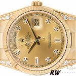 Rolex Day-Date 118338 Champagne Diamonds Dial 36mm Unisex Replica Watch features a 36mm yellow gold case with a stylish round fluted bezel with diamond lugs surrounding a champagne diamond dial on a yellow gold President bracelet with folding buckle.Day of the week window displayed at the 12 o’clock position.Date window displayed at the 3 o’clock position with a cyclops magnifying lens.Scratch resistant sapphire crystal. Screw down crown.