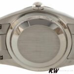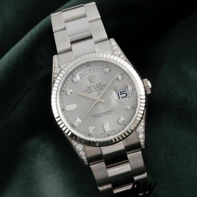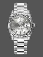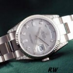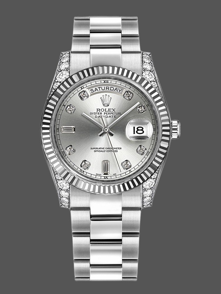Rolex Day Date 118339 Silver Dial Fluted Bezel 36mm Unisex Replica Watch has a White Gold 36 mm Round Case with Screw Down Crown and a White Gold Fluted Bezel. Diamond lugs on a white gold presidential bracelet, Silver dial with square and baguette diamond markers (very rare), date at 3 o’clock, day at 12, The reliable White Gold Oyster Bracelet will look great on your wrist.