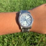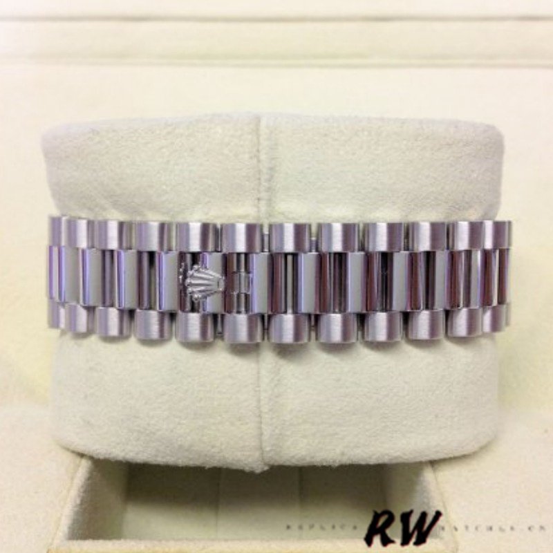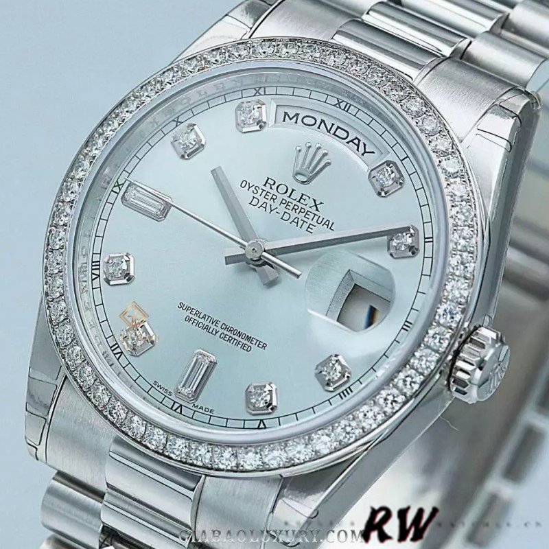 Rolex Day Date 118346 Ice Blue Dial 36mm Unisex Replica Watch. 36mm Polished platinum case featuring an ice blue diamond dot dial.The dial is surrounded by a factory set round brilliant cut diamond bezel,Day of the week window displayed at the 12 o’clock position.Date window displayed at the 3 o’clock position with a cyclops magnifying lens.The reliable White Gold Oyster Bracelet will look great on your wrist.