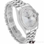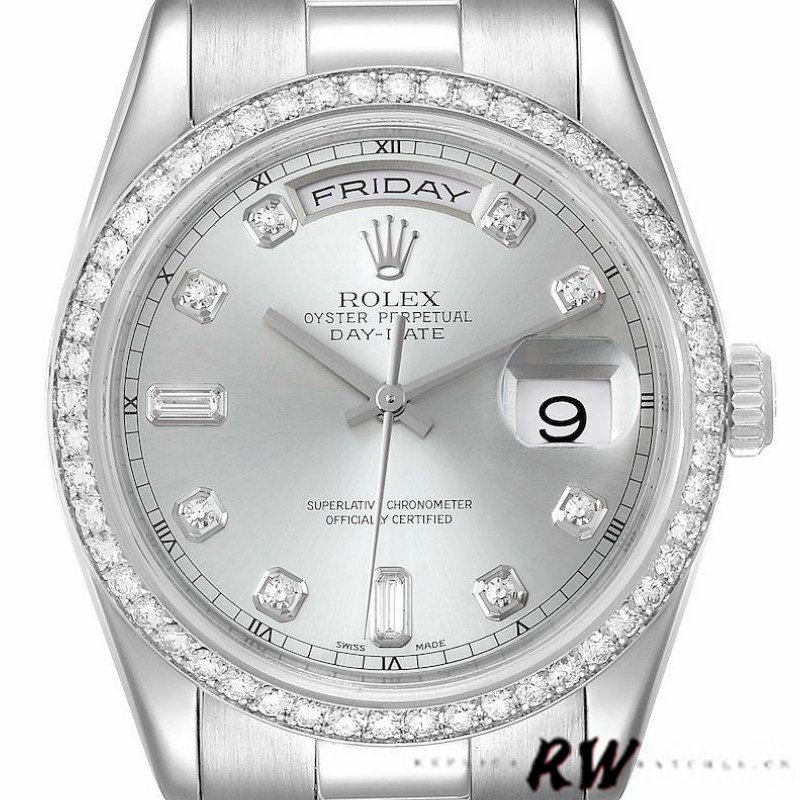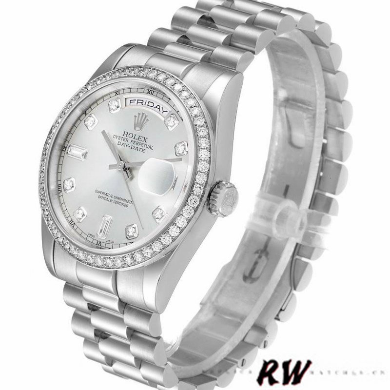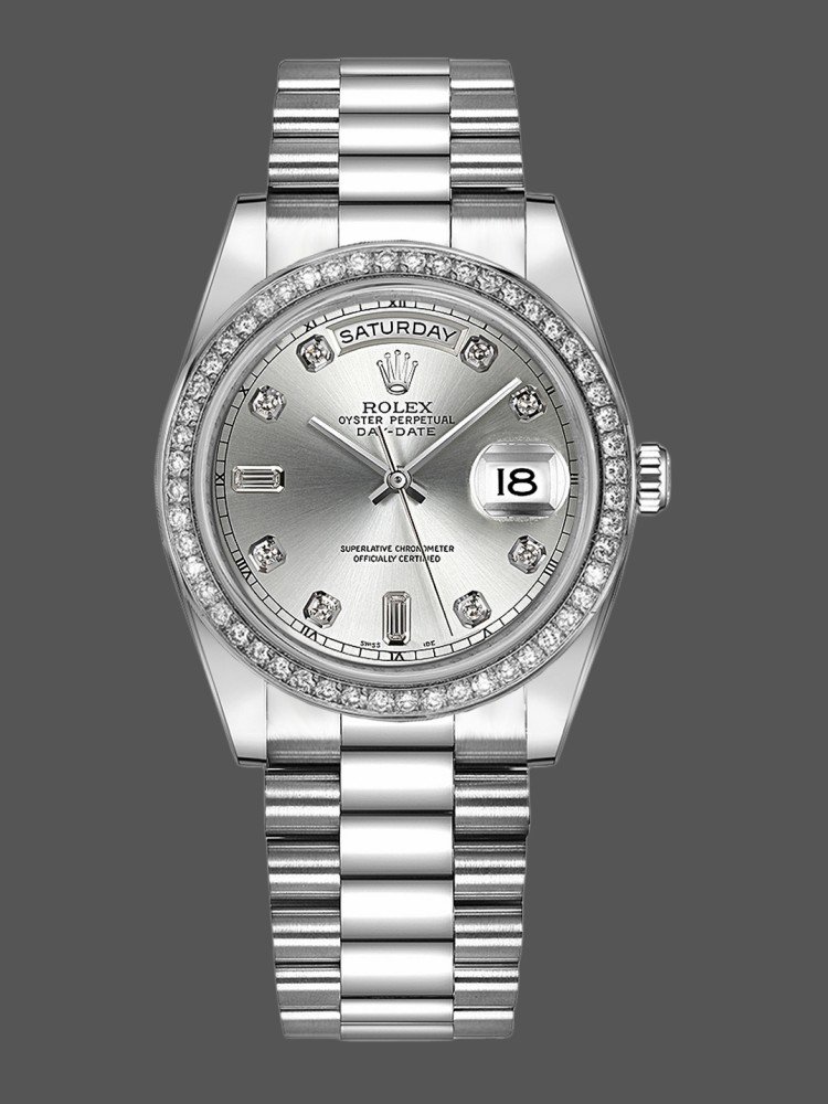Rolex Day Date 118346 Silver Dial Diamond 36mm Unisex Replica Watch. 36mm Polished platinum case featuring Silver Dial Set with Diamonds,The dial is surrounded by set round brilliant cut diamond bezel,Day of the week window displayed at the 12 o’clock position.Date window displayed at the 3 o’clock position with a cyclops magnifying lens.The elegantly designed Platinum with Concealed Folding Crownclasp will look great on your wrist.
