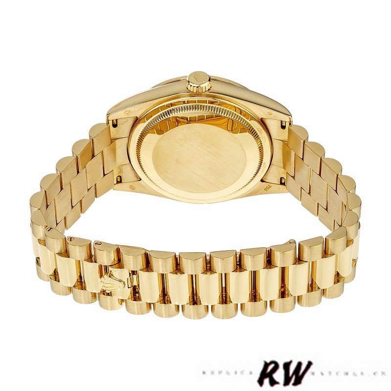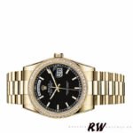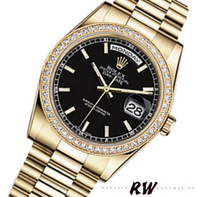Rolex Day Date 118348 Black Dial 36mm Unisex Replica Watch. 36mm Yellow Gold case featuring Black dial With Manufacturer Serial Numbers, date display at 3 o’clock,Day of the week window displayed at the 12 o’clock position with a cyclops magnifying lens.The dial is surrounded by set round brilliant cut diamond bezel, The elegantly designed with Concealed Folding Crownclasp will look great on your wrist.