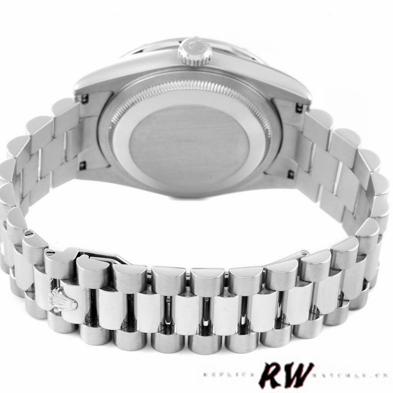 Rolex Day-Date 118366 Ice Blue Dial Diamond Bezel 36mm Unisex Replica Watch. Platinum oyster case 36.0 mm in diameter. Baguette diamond bezel. Scratch resistant sapphire crystal with cyclops magnifier. Ice blue dial with applied Roman numerals. Day of the week window displayed at the 12 o’clock position.Date window displayed at the 3 o’clock position.Platinum President bracelet with hidden clasp. Fits 7″ wrist.