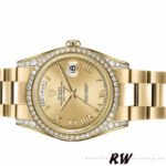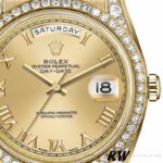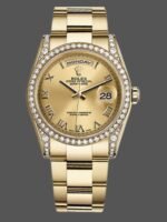 Rolex Day-Date 118388 Champagne Roman Numeral Dial 36MM Unisex Replica Watch features a 36mm Diamond set yellow gold case , Champagne Dial with Roman Numeral Hour Markers, Diamond-encrusted lugs, a matching diamond bezel, hour and minute hands, Scratch resistant sapphire crystal with cyclops magnifier. Day of the week window displayed at the 12 o’clock position.Date window displayed at the 3 o’clock position.The elegantly designed with Concealed Folding Crownclasp will look great on your wrist.