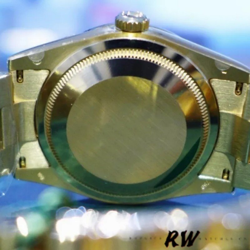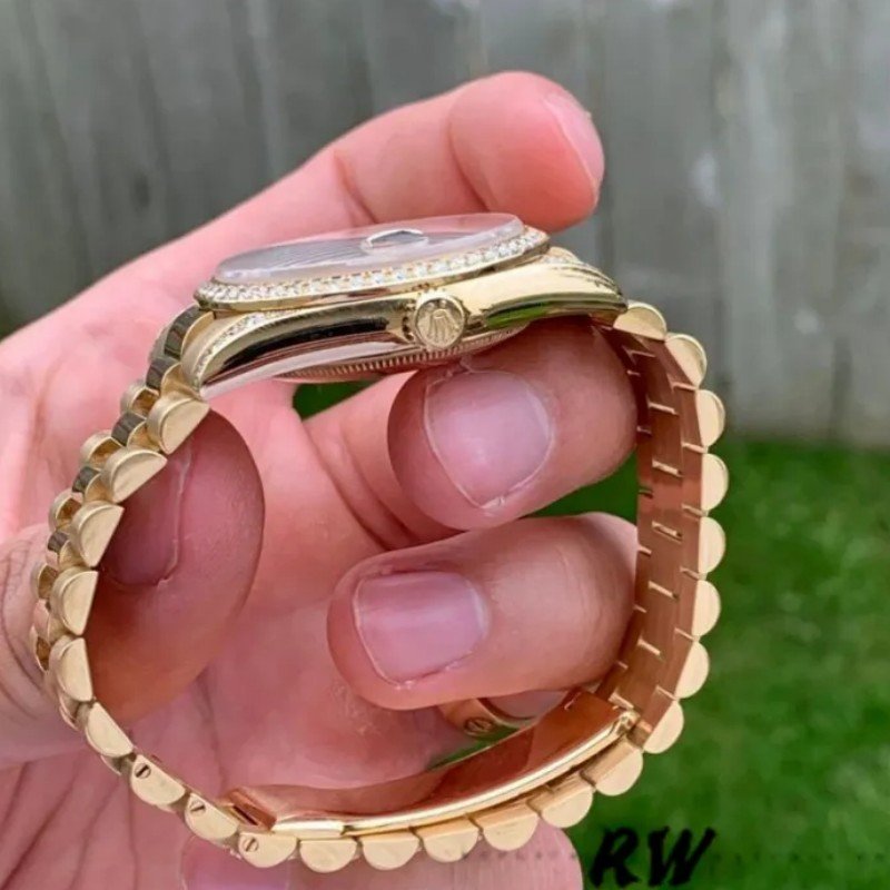 Rolex Day-Date 118388 Diamond Bezel Champagne Dial 36MM Unisex Replica Watch,36.0 mm yellow gold oyster case in diameter. screw-down back, screw-down crown with twinlock double waterproofness system, bezel set with diamonds, scratch-resistant sapphire crystal with cyclops lens over the date, champagne dial, diamond hour markers, Sweep center seconds. Outer minute and 1/2 seconds divisions, aperture for day at 12, aperture for date at 3. Yellow gold President bracelet with semi-circular three-piece links , concealed folding Crownclasp buckle.