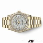 Rolex Day-Date 118388 Yellow Gold Diamond Meteorite Dial 36MM Unisex Replica Watch features 36mm yellow gold Diamond case, Meteorite Grey Dial Set with Diamonds, Diamond-encrusted lugs, a matching diamond bezel, hour and minute hands, Scratch resistant sapphire crystal with cyclops magnifier. Day of the week window displayed at the 12 o’clock position.Date window displayed at the 3 o’clock position.The elegantly designed with Concealed Folding Crownclasp will look great on your wrist.
