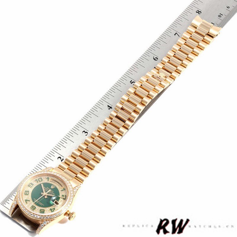 Rolex Day-Date 118388 Yellow Gold Green Enamel Diamond Dial 36MM Unisex Replica Watch features a 36mm Diamond set yellow gold case . Has an attractive Diamond Pave Green Enamel Dial with Arabic Dial Markers, Diamond-encrusted lugs, a matching diamond bezel, Day of the week window displayed at the 12 o’clock position.Date window displayed at the 3 o’clock position.The elegantly designed with Concealed Folding Crownclasp will look great on your wrist.