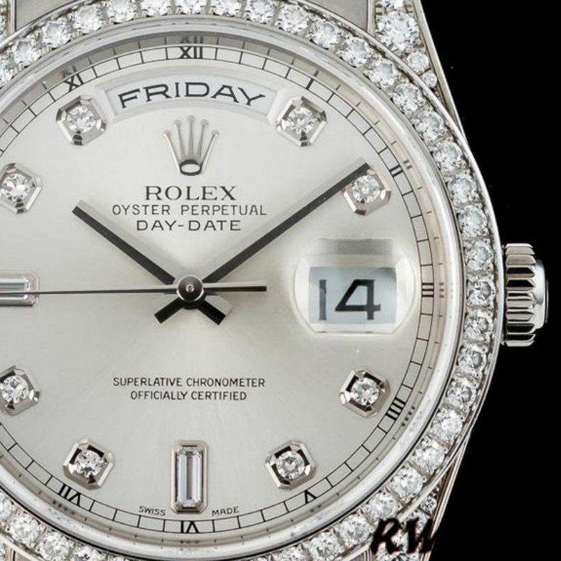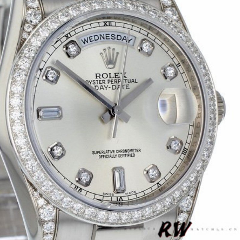 Rolex Day-Date 118389 Silver Diamond dial 36MM Unisex Replica Watch features a 36mm white gold case ,Silver Dial Set with Diamonds with Diamonds Set on Bezel and Lugs, Scratch resistant sapphire crystal with cyclops magnifier. Day of the week window displayed at the 12 o’clock position.Date window displayed at the 3 o’clock position.White gold Presidential bracelet with folding buckle.