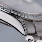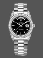 Rolex Day-Date 118389 White Gold Black Index Dial 36MM Unisex Replica Watch features a 36mm white gold case ,Black Dial with Index Hour Markers with Diamonds Set on Bezel and Lugs, Scratch resistant sapphire crystal with cyclops magnifier. Day of the week window displayed at the 12 o’clock position.Date window displayed at the 3 o’clock position.White gold Presidential bracelet with folding buckle.