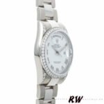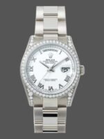 Rolex Day-Date 118389 White Roman Numeral Dial 36MM Unisex Replica Watch features a 36mm white gold case ,White Dial with Roman Numeral Hour Markers with Diamonds Set on Bezel and Lugs, Scratch resistant sapphire crystal with cyclops magnifier. Day of the week window displayed at the 12 o’clock position.Date window displayed at the 3 o’clock position.White gold Presidential bracelet with folding buckle.