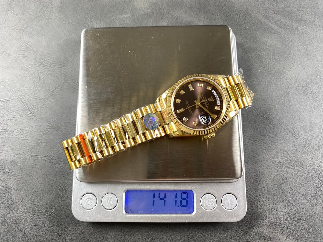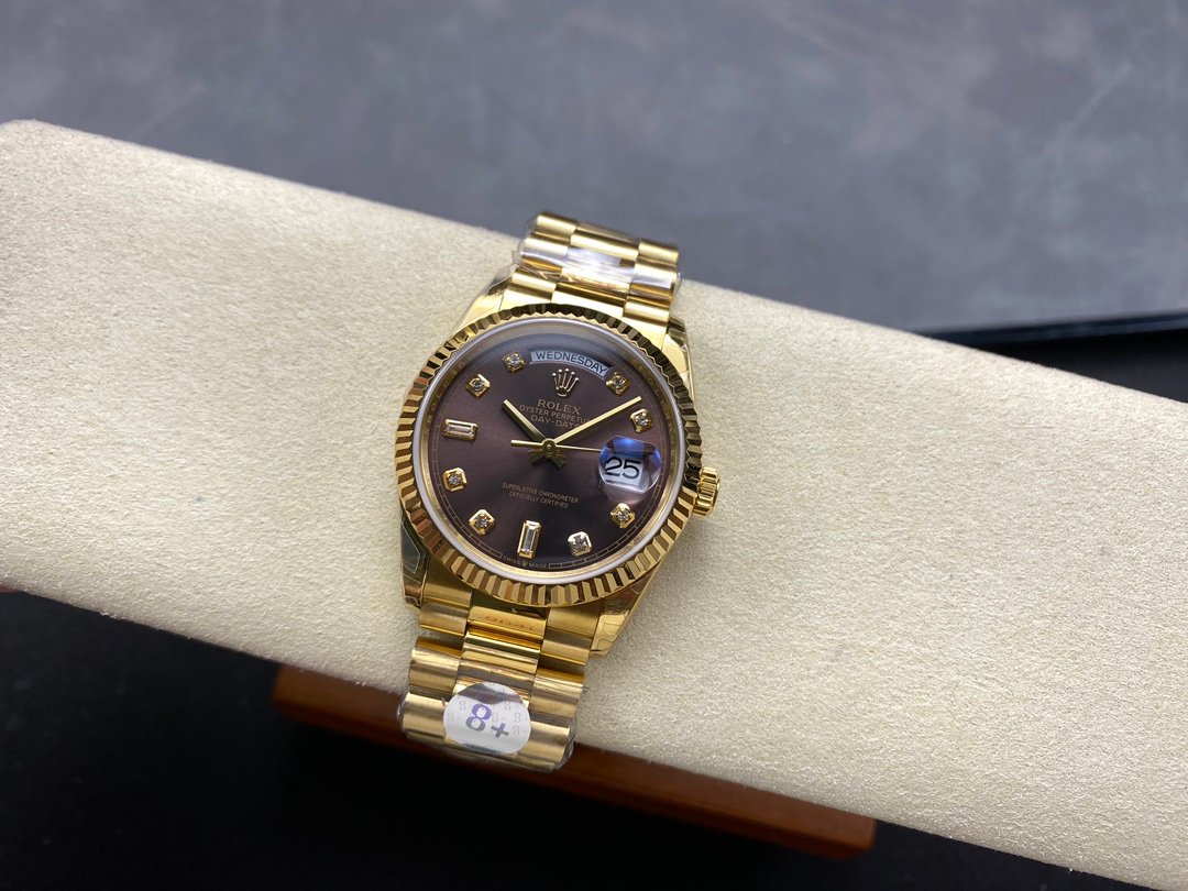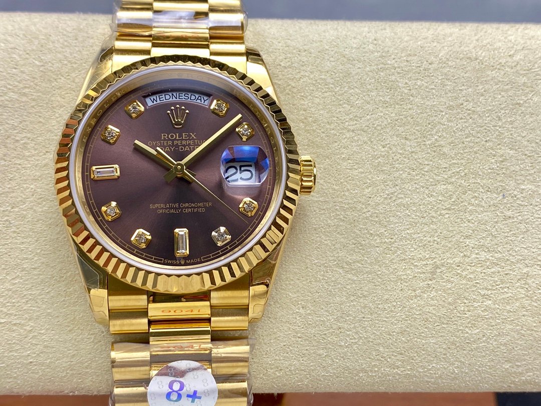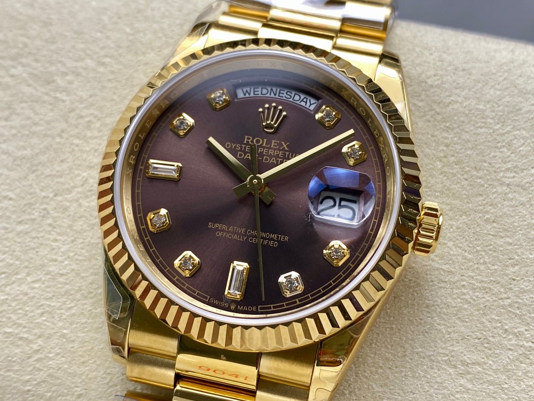 Rolex Day-Date 128238 Fluted Bezel Dark Grey Dial 36MM Replica Watch,36mm yellow gold case, screw-down back, screw-down crown with twinlock double waterproofness system, fluted bezel,Dark Grey Dial with Diamond Hour Markers.Date window displayed under cyclops lens at 3 o’clock. Day window displayed at 12 o’clock.Instantaneous day and date setting.Yellow gold President bracelet with semi-circular three-piece links, concealed folding Crownclasp buckle.